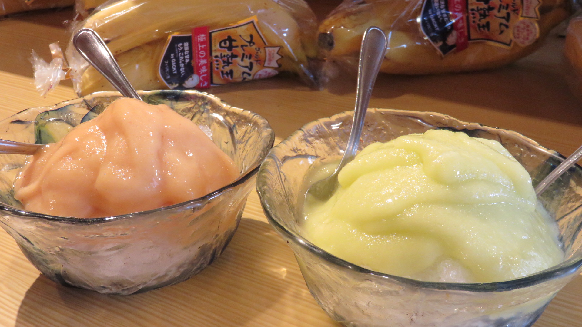こじんまりとした地味な店構えですが、フルーツ店のかき氷に期待が高まります。結局、子供たちは白桃と静岡メロンに惹かれた模様。