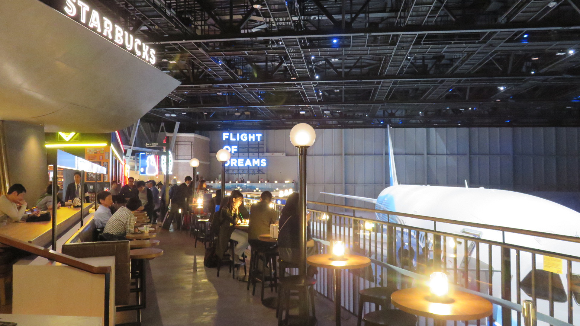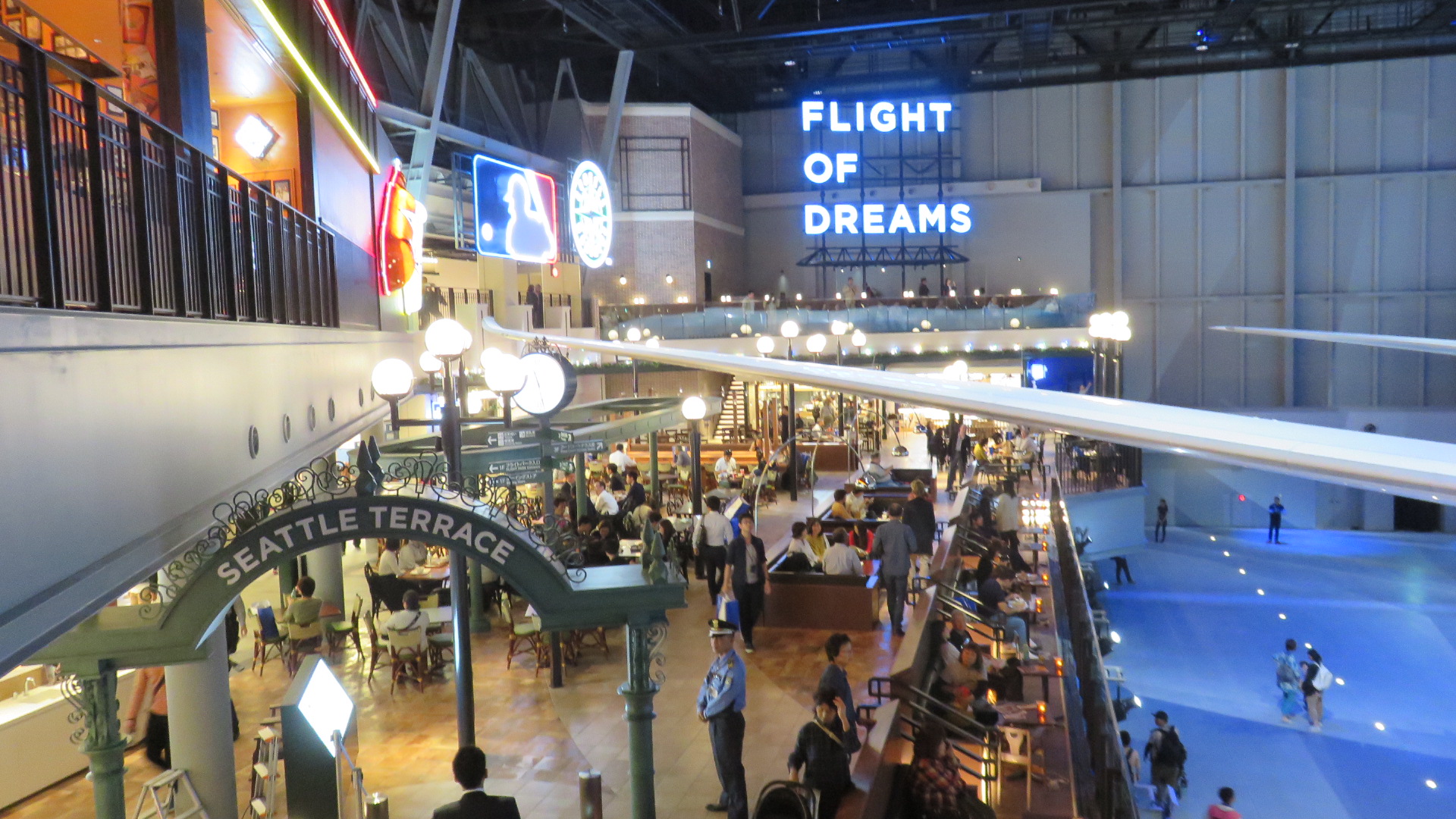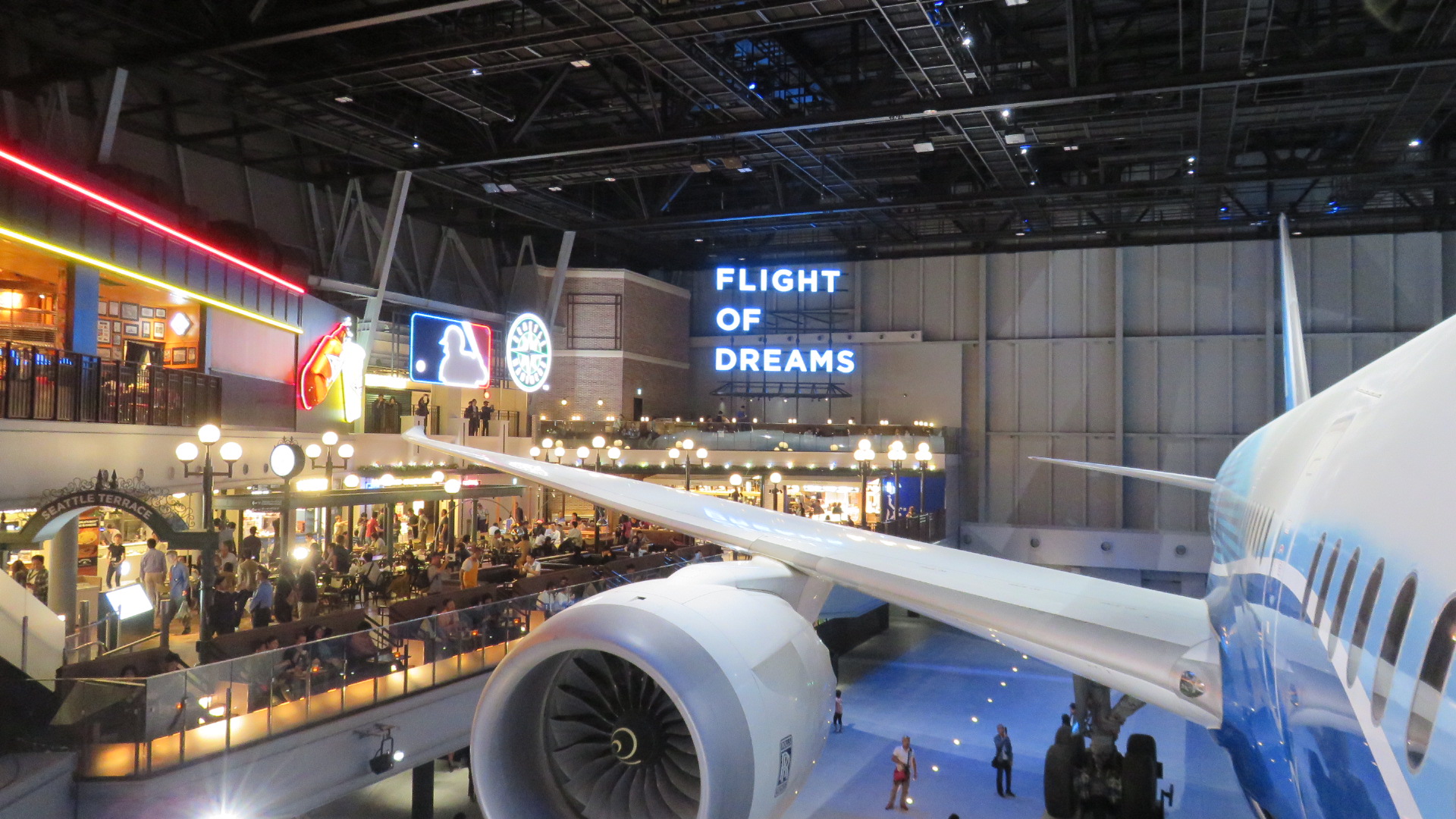 施設内は、シアトルの町中を模した飲食スペース(無料)とボーイング787ドリームライナーを格納した展示スペース(有料)に分かれている。