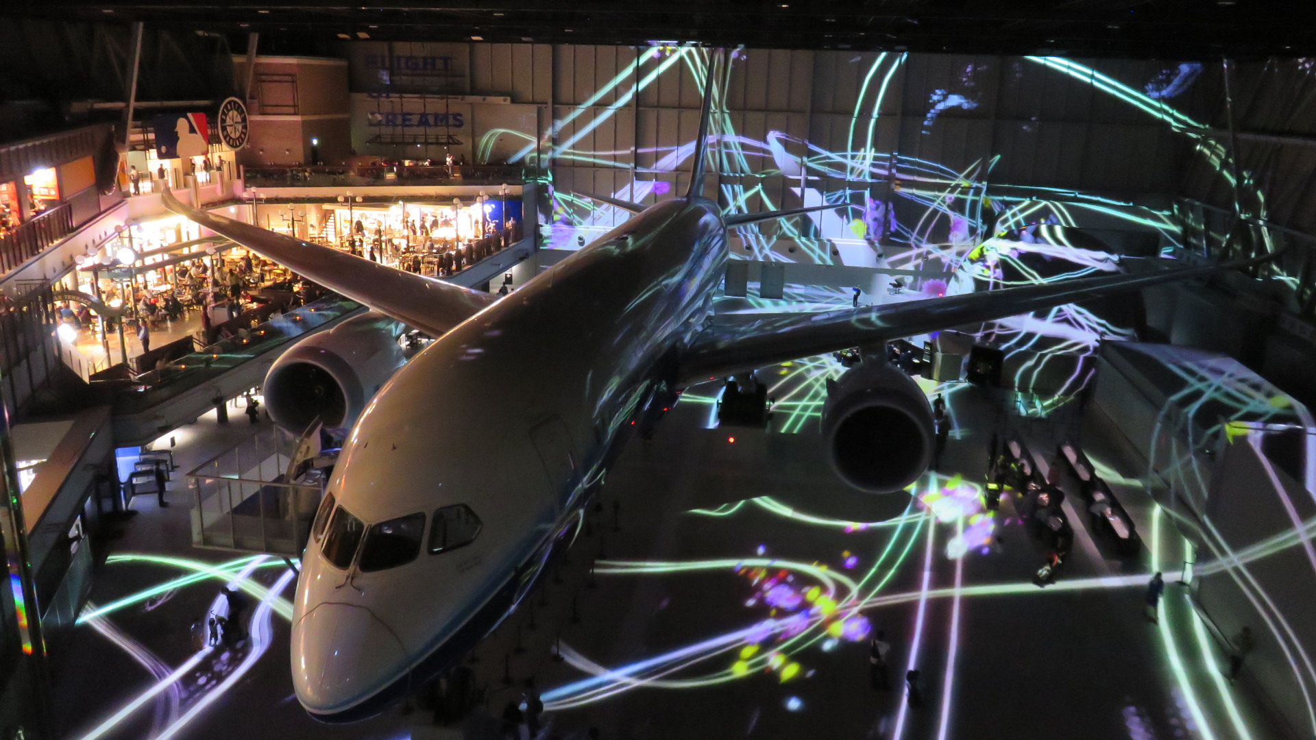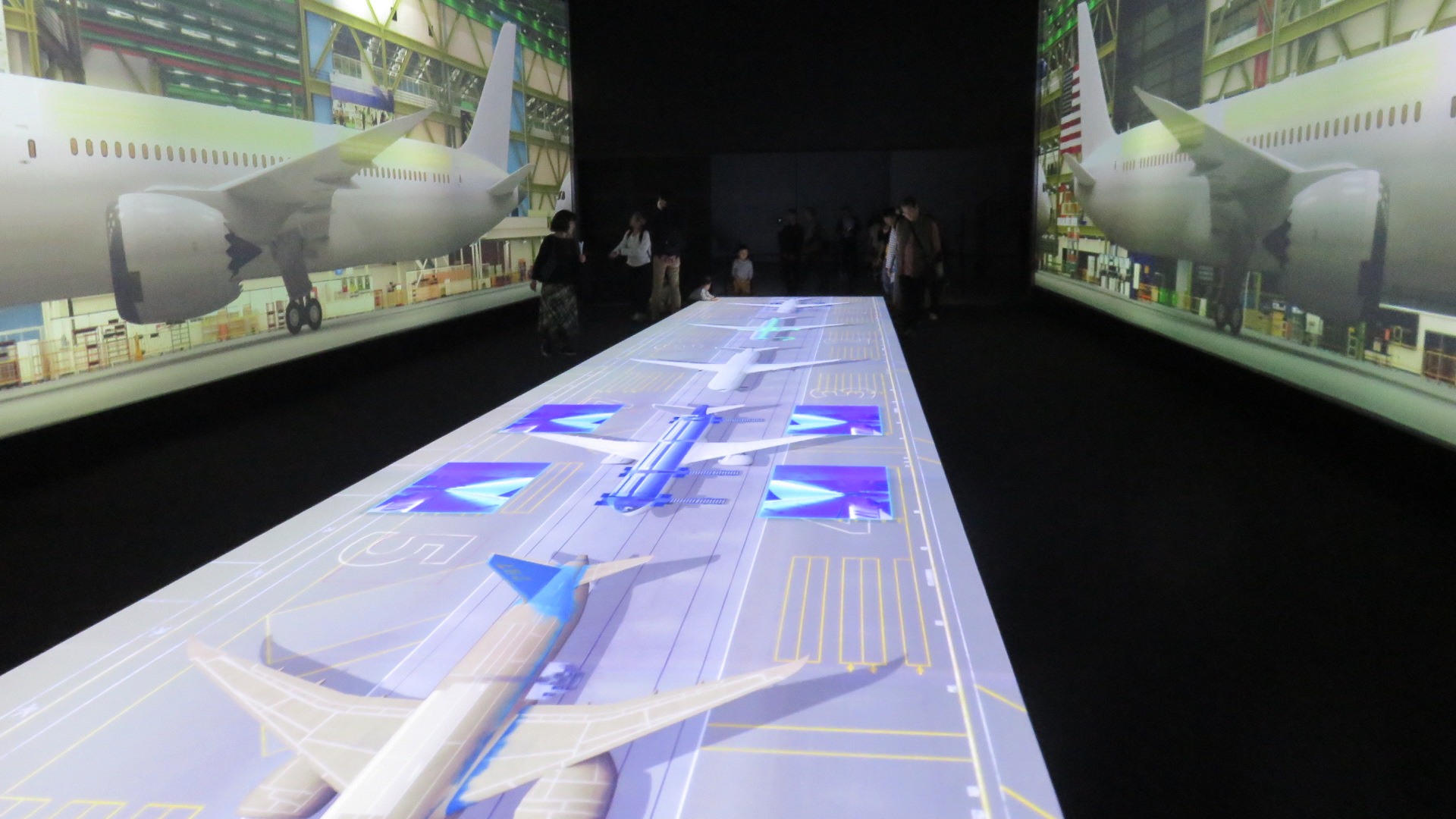プロジェクションマッピングを4階から眺めることができるという「フライウィズ787ドリームライナー」の整理券を先に確保してから展示スペースを探索することに。