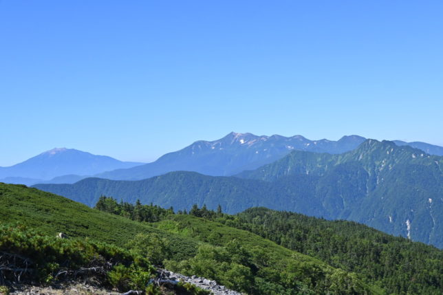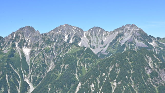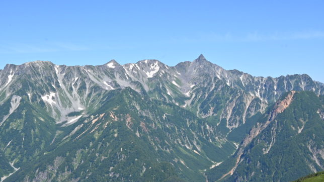 左から御嶽山、乗鞍岳、焼岳、前穂高岳、奥穂高岳、涸沢岳、北穂高岳、大キレット…槍ヶ岳…表銀座ルートの大天井岳や燕岳も見えます。