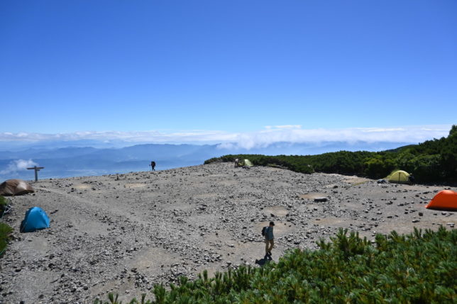 windy、大天井岳・テン場、コーヒー・ミル、豆入り、ジェットボイル、ライター、カップ、クロワッサン、スープ、水、座布団