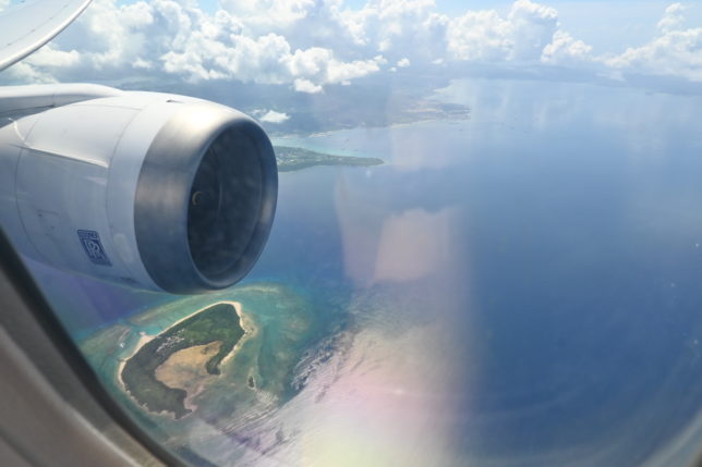 機が降下をはじめ、機上からは与論島や古宇利島、水納島、伊江島などが見え、いよいよ沖縄圏内に入ったことを感じ、ワクワクします。