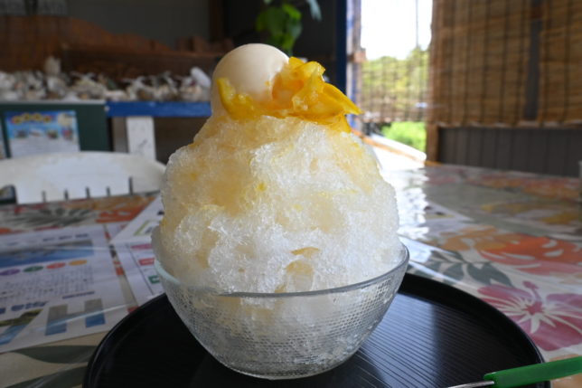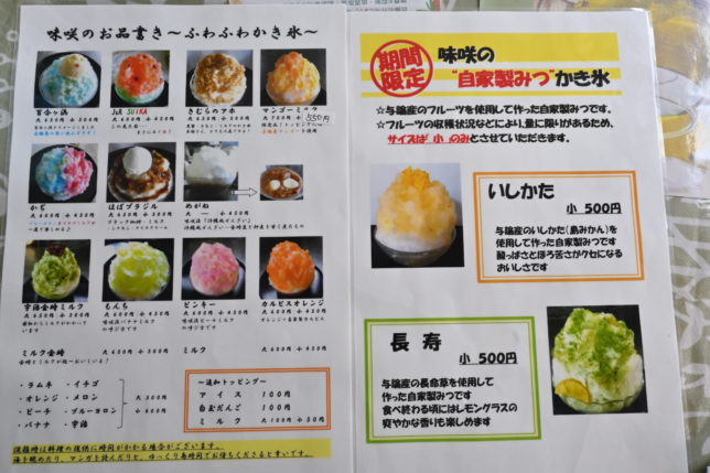 与論島の最後の晩餐。名物のもずく系の食事と与論産フルーツのかき氷「いしたか」(アイストッピング)。旨っ!