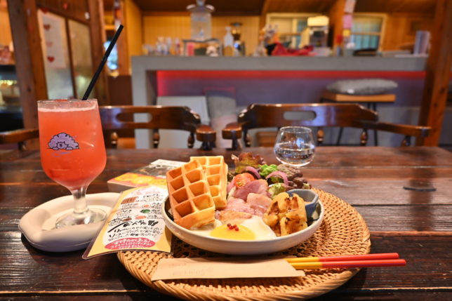 海外ムード漂う音楽が流れる中、米粉のワッフルに、琉球けい卵を載せ、トマトベースのオーロラソースを絡めていただく朝のひとときは至福。